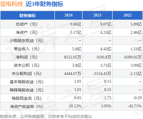 从目前公布的财报来看,亚电科技2024年总资产为9.06亿元,净资产为5.17亿元;近3年净利润分别为8512.05万元(2024年),1036.8万元(2023年),-9399.02万元(2022年)。详情见下表: